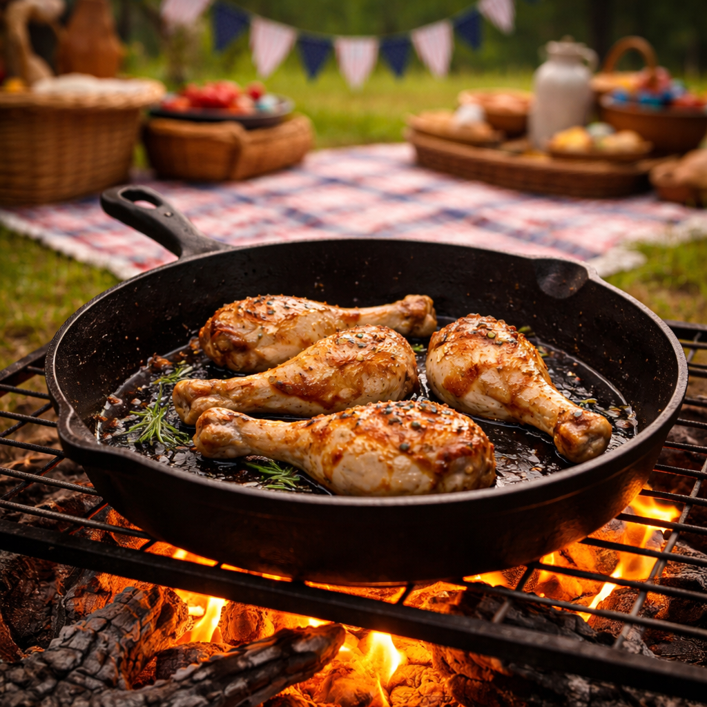 When I think back to that summer, I don’t remember elaborate spreads or complicated recipes. I remember simple food shared outside. A basket of bread or fresh rolls. Chicken legs wrapped in paper and eaten with your hands. A wedge of cheese, sliced apples, maybe a bowl of berries. Lemonade poured into mason jars. Colonial meals weren’t about impressing anyone — they were about gathering. For a 1776-style picnic today, I love keeping the food rustic and uncomplicated. Fresh fruit, homemade biscuits or hand pies, cold drinks in pitchers, and food that invites you to sit longer and talk. Keeping it colonial and for cooking over coals, a cast iron skillet is my favorite. It’s sturdy, heats evenly, and works beautifully for apple cakes, skillet breads, and sautés.